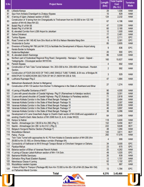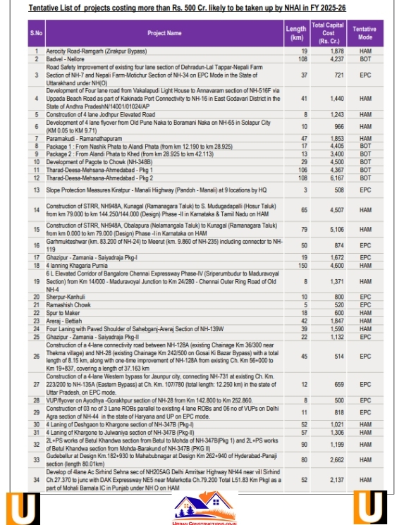 Tentative List of projects costing more than Rs. 500 Cr. likely to be taken up by NHAI in FY 2025-26